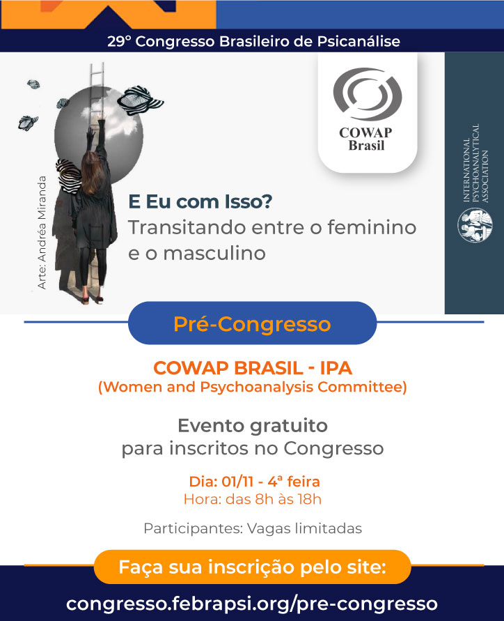 A III Jornada do COWAP BRASIL (Women and Psychoanalysis Committee) ocorrerá no período pré-congresso do 29º Congresso Brasileiro de Psicanálise, no dia 01 de novembro de 2023, quarta-feira pela manhã e à tarde, presencialmente, no Hotel Royal Plaza em Campinas (SP). Haverá espaços para temas livres, e o evento será gratuito aos inscritos no Congresso. Vagas limitadas.
